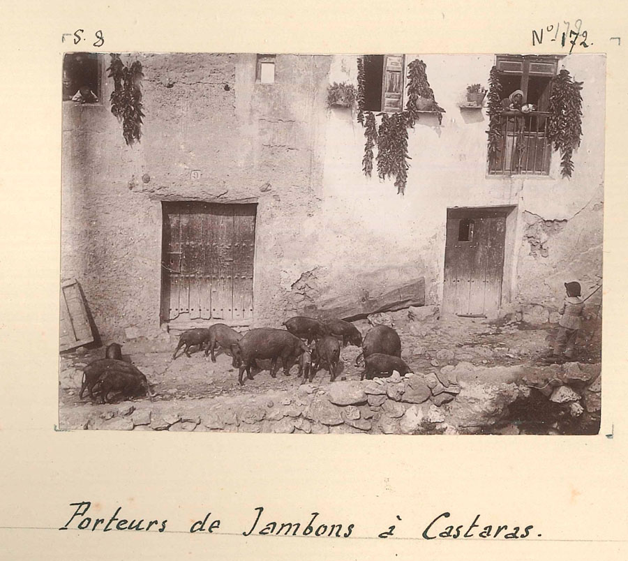 La ambición documental se traduce en una variedad de encuadres y temas que desbordan cualquier interés puramente geológico. Hay vistas generales que capturan la topografía con precisión cartográfica, pero también retratos espontáneos, escenas de trabajo, arquitectura popular y detalles domésticos que solo alguien instalado en el lugar habría podido registrar. Incluso los títulos manuscritos revelan una complicidad creciente con el entorno: «Porteurs de jambons», lejos de referirse a cargadores humanos, designa con humor galo a una piara de cerdos que atraviesa la Higuerilla, un guiño que delata la mirada irónica y afectuosa del autor.