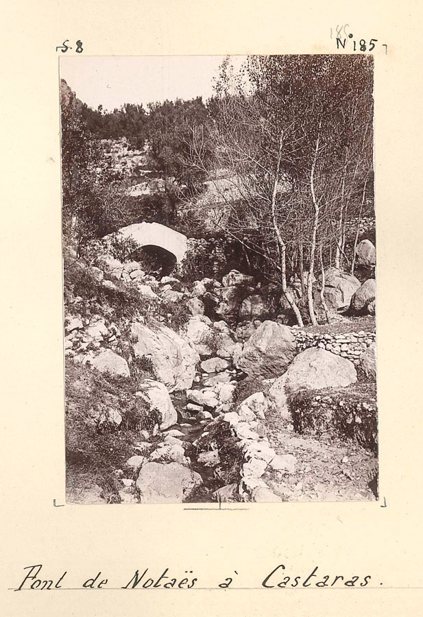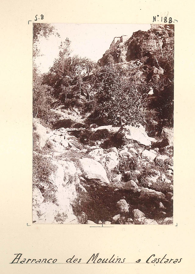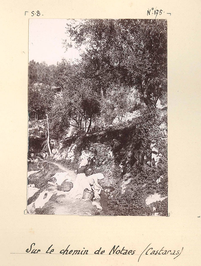 El agua constituye otro de los ejes silenciosos del álbum. Busquet dedica varias placas a los barrancos, fuentes y pasos que articulaban la vida material de Cástaras. Son espacios donde confluyen naturaleza y trabajo, y donde el paisaje adquiere un carácter casi autónomo.
