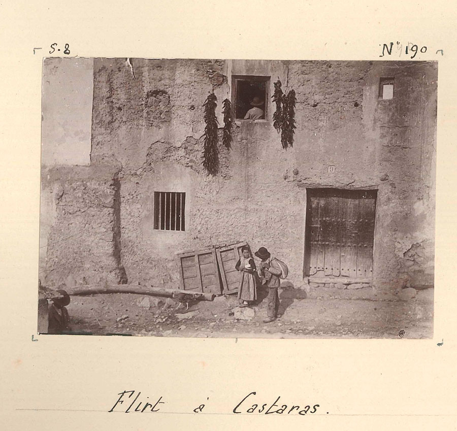 Una parte sustancial de las fotografías tomadas en Cástaras responde a un mismo punto de vista, reiterado y deliberado. Busquet convierte la casa de don Baldomero Villanueva —y en particular su balcón sur a la calle San Miguel— en un auténtico observatorio desde el que registra la vida cotidiana del pueblo sin interferir en ella. La altura, el ángulo y la relativa distancia producen una sensación de mirada discreta, casi furtiva, que permite captar escenas de tránsito y convivencia con una naturalidad poco frecuente en la fotografía de finales del siglo xix.